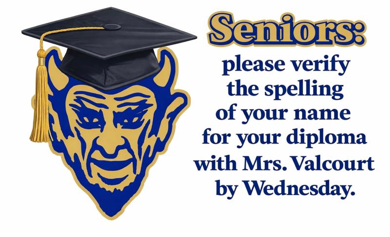 Seniors that have not verifyed the spelling of their name already, must see Mrs. Valcourt by Wednesday, January 28.