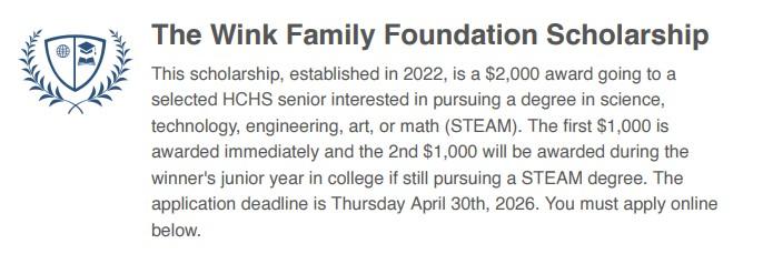 Wink Family STEM Scholarship March 12, 2026 - April 30, 2026 Visit the HCHS Guidance page for more informaiton. The deadline to apply online is April 30, 2026. Permalink: http://holmeshigh.sites.thedigitalbell.com/2026/3/wink-family-stem-scholarship